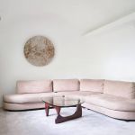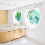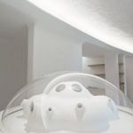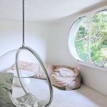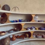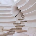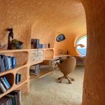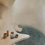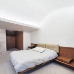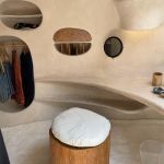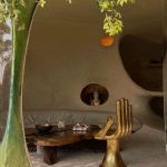 In its belly is a spacious 5-bedroom apartment featuring subdued, natural colors, wood details and almost primitive-looking furniture.